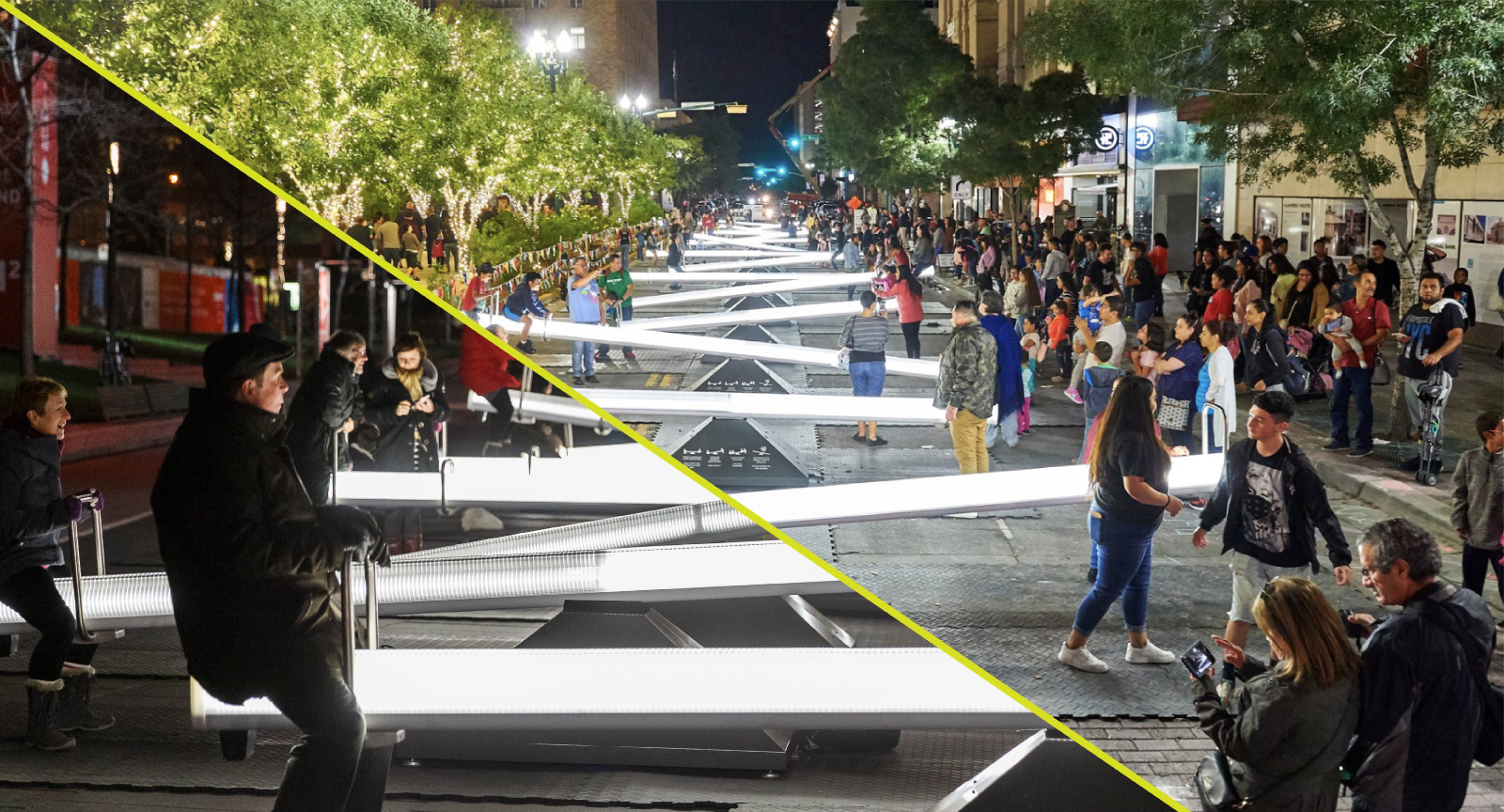 IMPULSE started as part of the 6th edition of Luminotherapie in 2015 and 2016 at the Place des Festivals in the Quartier des Spectecales in Montreal. It is an art installation of twelve LED seesaws that experiments with light and sound when activated by the public, creating an ever-changing composition of dynamic light and sound wave pulses through the park.