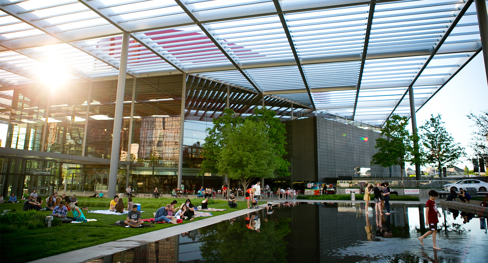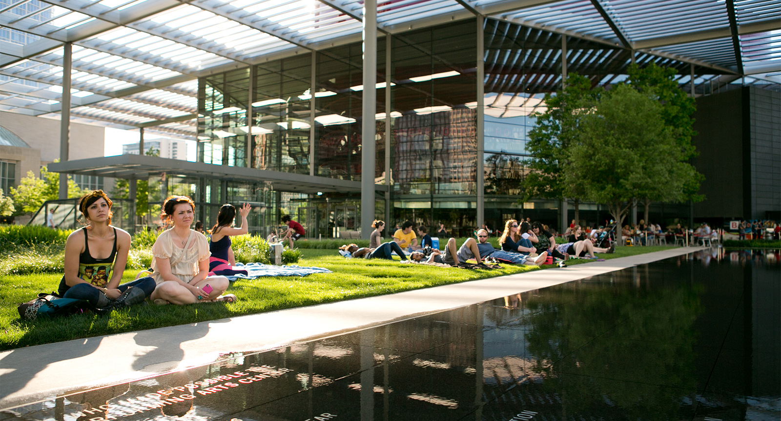 The entrance to the Winspear Opera House features the Annette and Harold Simmons Signature Glass Facade, which ascends 60 feet creating a seamless visual appearance between the vibrant red glass panels of the McDermott Performance Hall and the surrounding Sammons Park. Radiating from the Winspear Opera House on all sides, the Sky Canopy provides shade to the Simmons Glass Facade over three acres of Sammons Park, defining new outdoor spaces for visitors to gather.