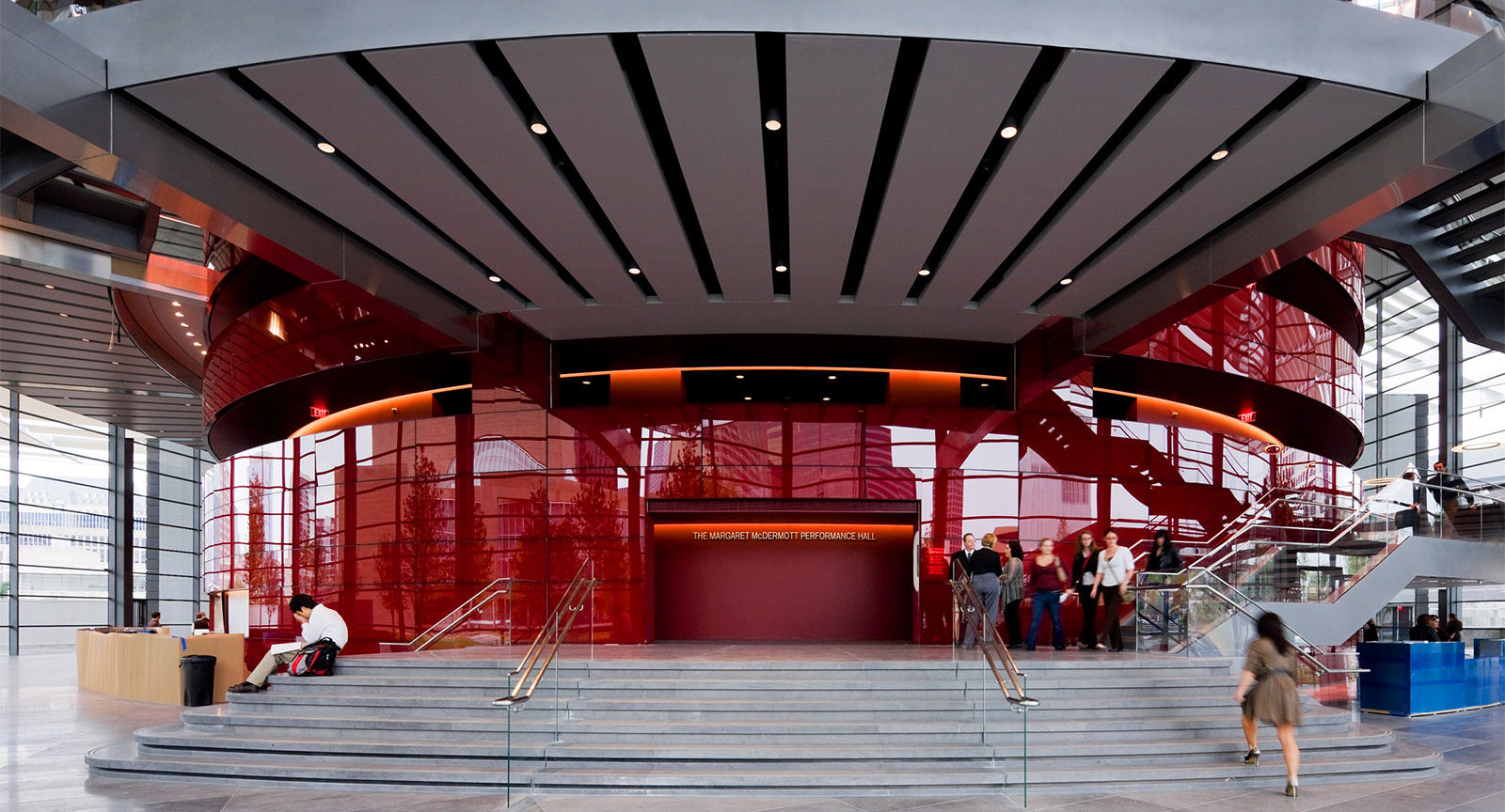 The principal performance space, The Margaret McDermott Performance Hall, features retractable screens, a spacious fly-tower, a three-square stage with generous side and rear stage areas, variable acoustics, and accommodates 2,200 patrons.